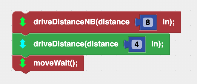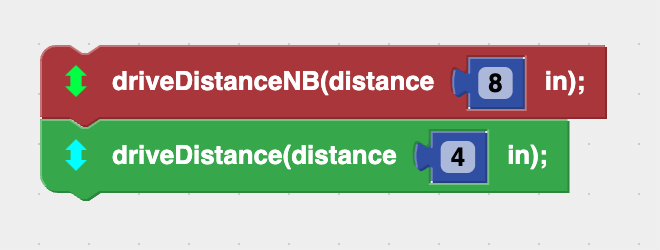This example makes Robot 1 and Robot 2 move at the same time. Robot 1 is supposed to go 8 inches, and Robot 2 goes 4 inches. But the moveWait block is not used. So when Robot 2 finishes moving, the program stops early, and Robot 1 does not finish driving the full 8 inches. |