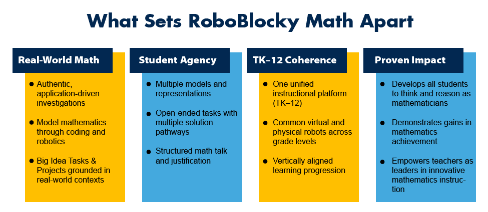 RoboBlocky’s TK–12 Mathematics, Computer Science, Engineering Design, Expanded Learning, and RoboPlay Challenge Competition curricula provide schools and districts with flexible, cost-effective options for delivering High-Quality Instructional Materials (HQIM) that strengthen mathematics, computer science, and STEAM education. Classroom and district implementations, along with associated student outcomes, are illustrated in the RoboBlocky Math Showcases.