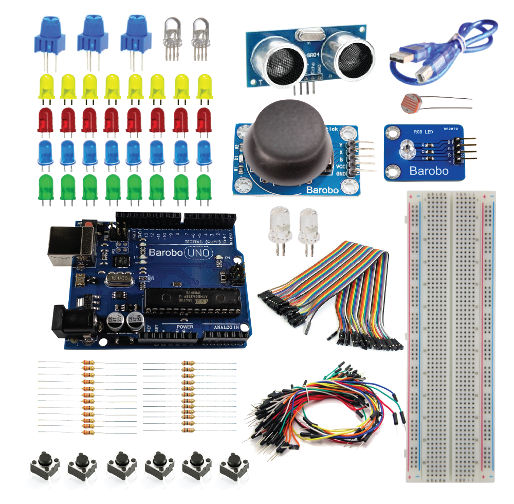 Arduino plus Ultrasonic Sensor hardware: The Barobo Starter Kit (Arduino-Uno-Compatible) includes an ultrasonic distance sensor among its items (the one that looks like two eyes):