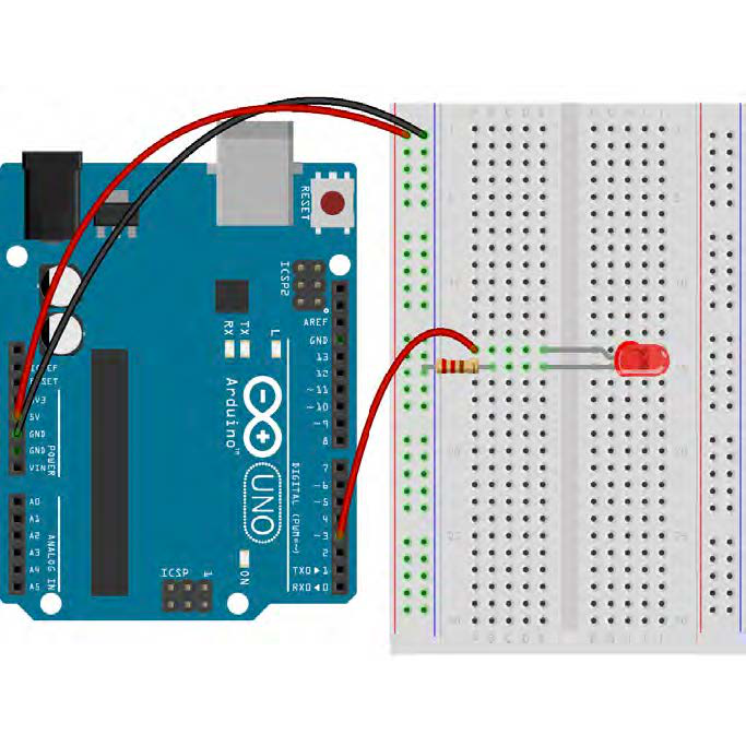And this shows what it looks like in real life, with the LED and 220-ohm resistor plugged into a breadboard: