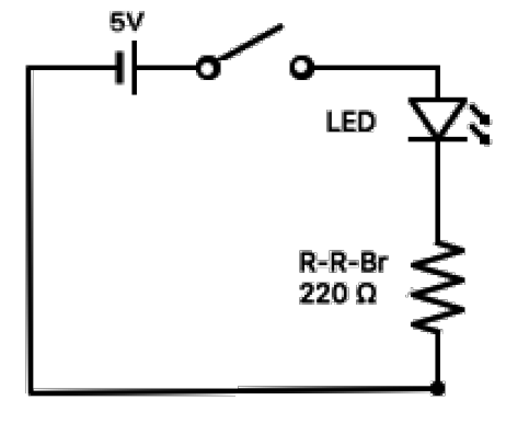 At the most fundamental level, a digital output is like a light switch, as shown in the circuit diagram below (consisting of a 5V battery, a switch, LED light, and a 220 ohm resistor). If the switch is open, the light is in the off state. If the switch is closed, the light is in the on state.