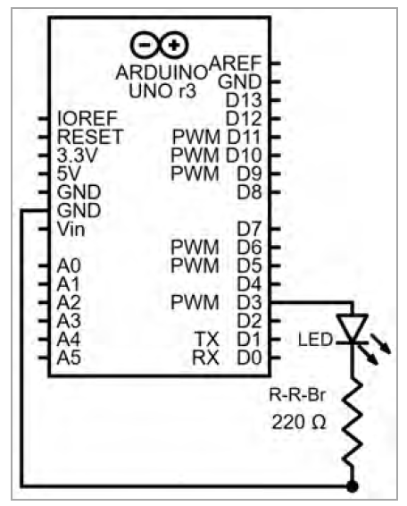Note that the positive (longer kinked) lead of the LED is connected through the short red wire to digital pin 3 on the Arduino, and the negative lead of the LED is connected through the resistor (and then through the black wire) to ground. The longer red wire at the top is connected to the 5V power pin on the Arduino. The Arduino is then connected to the computer via a USB cable, as with the blue cable below (breadboard not shown):