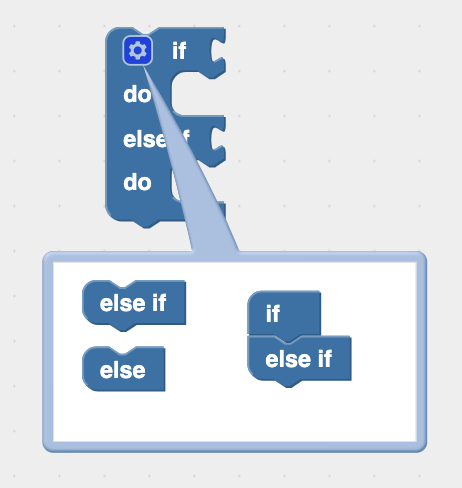2. Using the if-elseif-else Block We create an if-elseif-else block in a similar way as the if-else block. Click the gear icon on the if block and then drag the "else if" block under the "if" block and click them together: