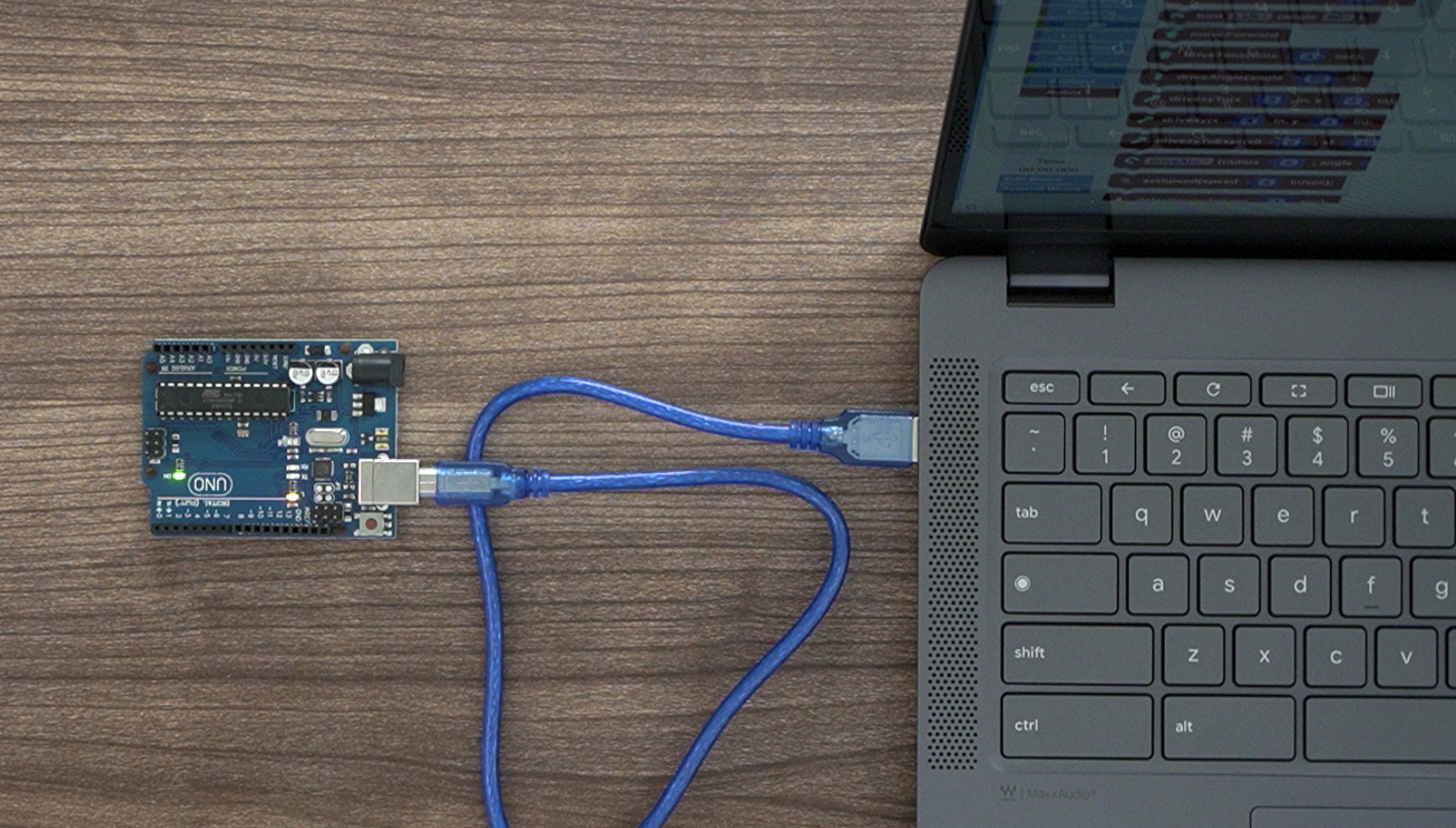 2. Connect the Arduino Board to the Computer To get started, plug the Arduino into your Chromebook using a USB cable. When it is connected, you should see a light turn on. This shows that the board is getting power from the Chromebook. If your Chromebook shows a message about connecting to Linux, you can ignore it. ![]()