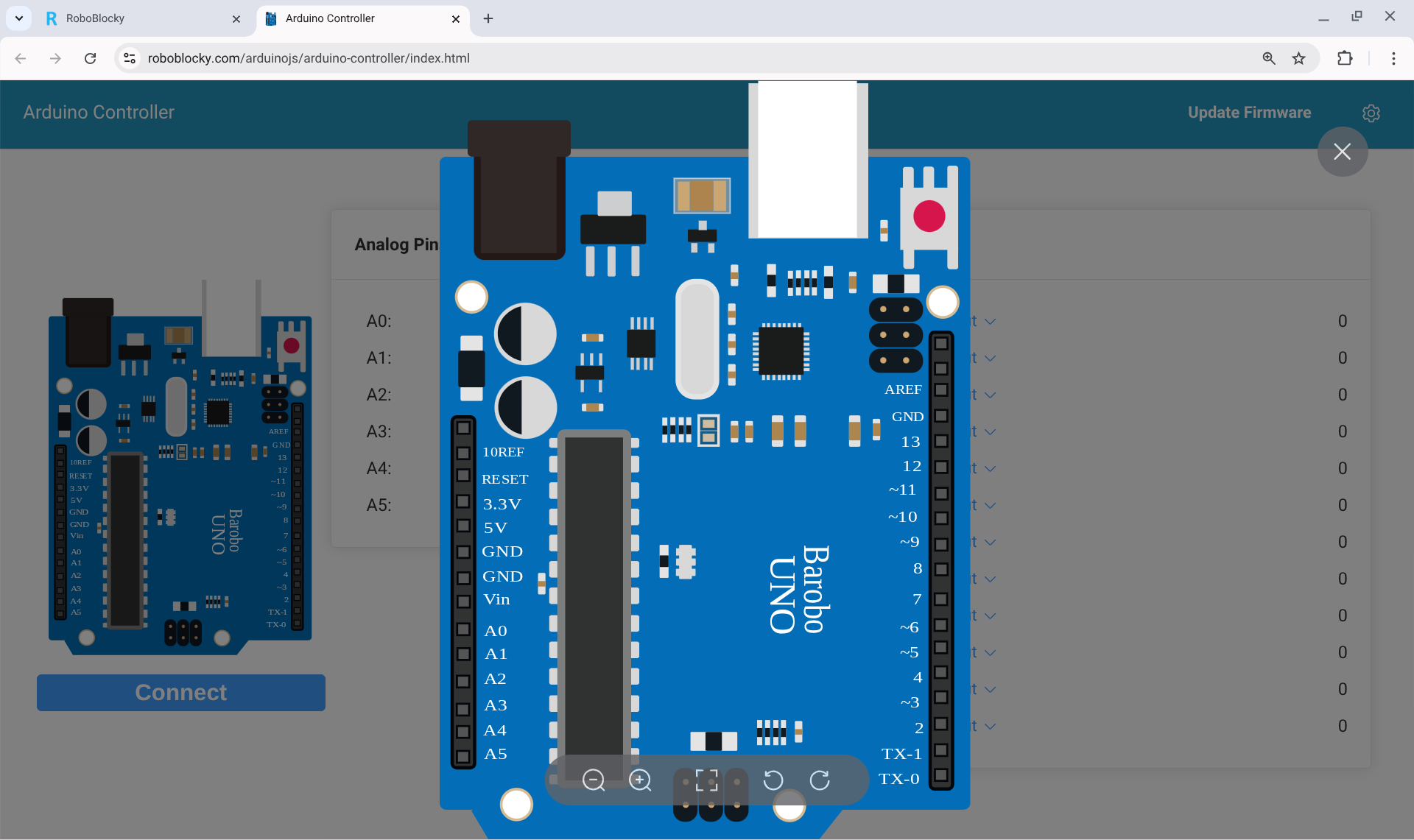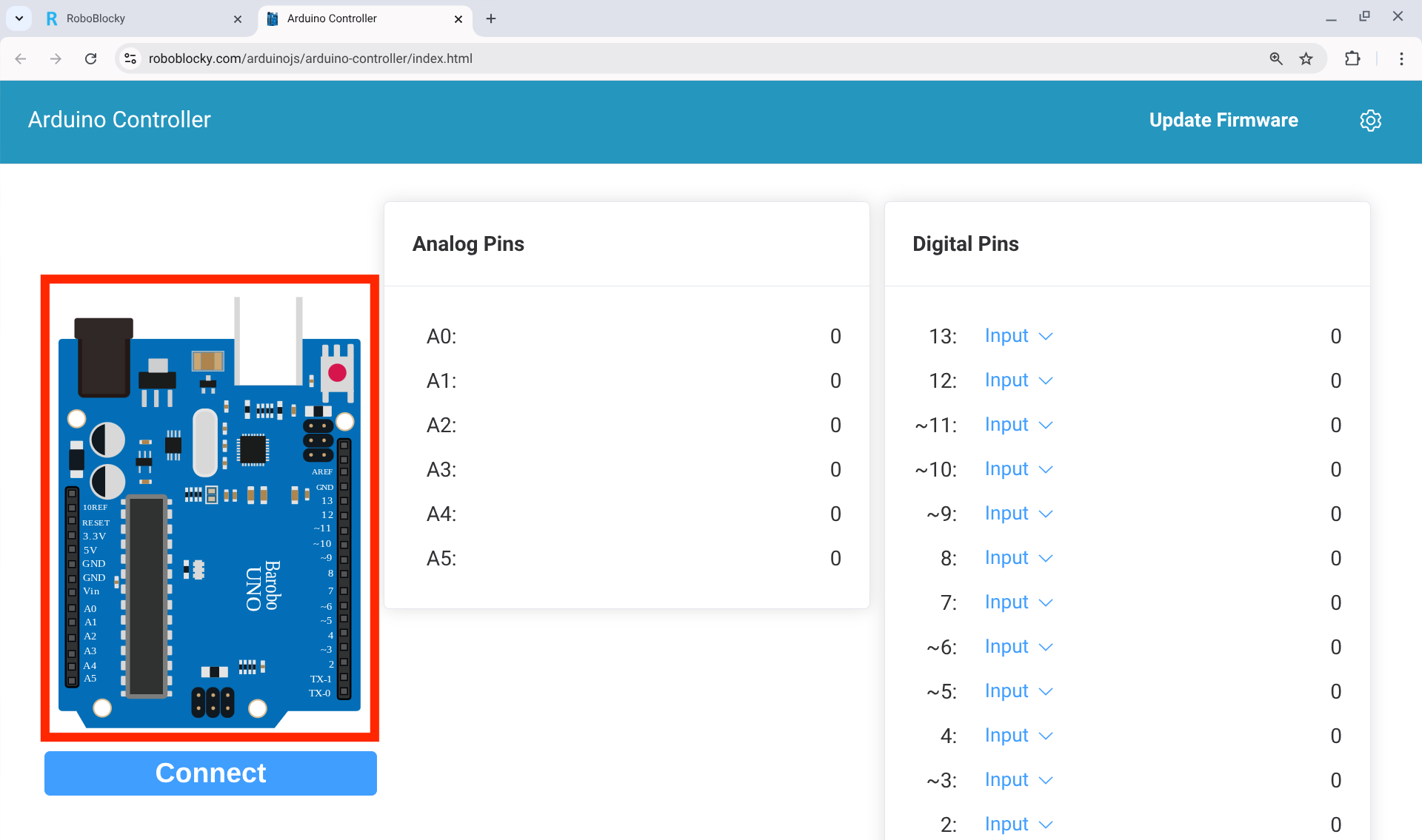 4. The Arduino Controller Window The Arduino Controller window will appear in a new tab. This window shows a picture of the Arduino board with all of its analog and digital pins. You can use this window to control the input and output pins on the board. To connect RoboBlocky to the Arduino, click the Connect button.