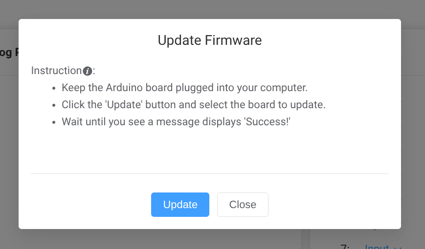 If your Arduino is new or has never been used with RoboBlocky before, it may need a firmware update. To do so, unplug the Arduino first. Then, click the "Update Firmware" button in the top right corner of the Arduino Controller window.