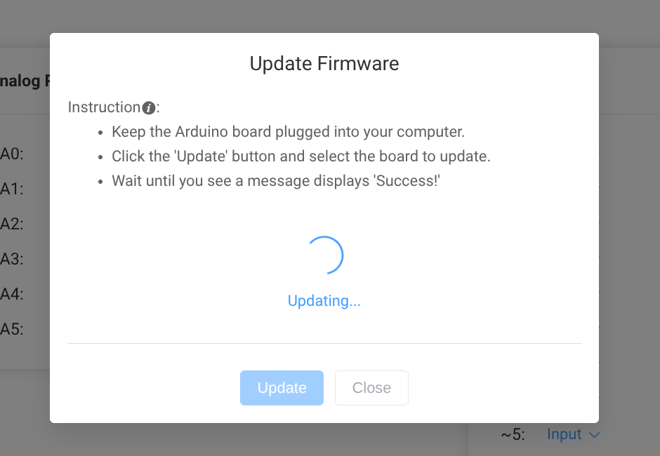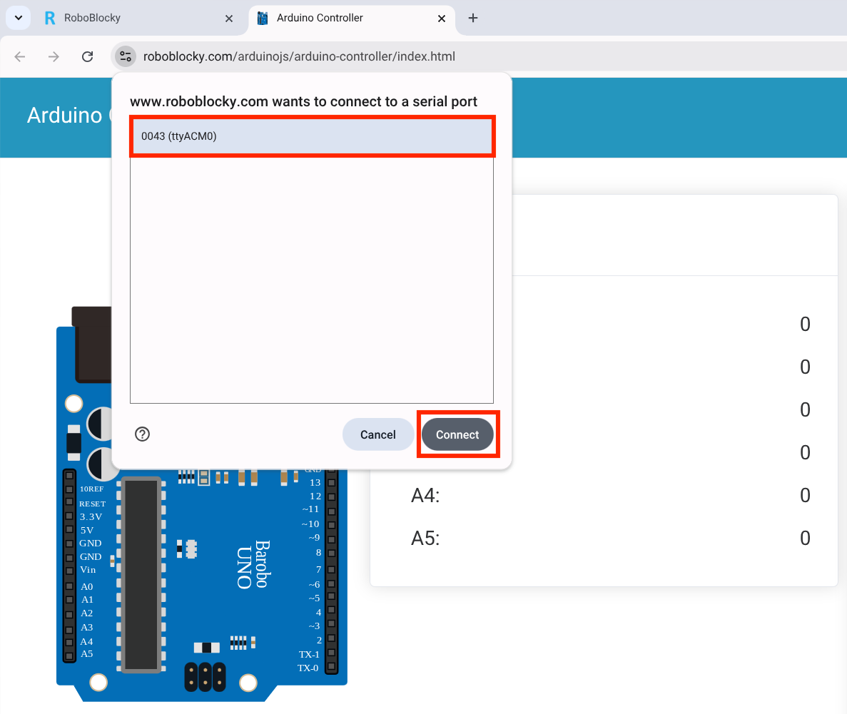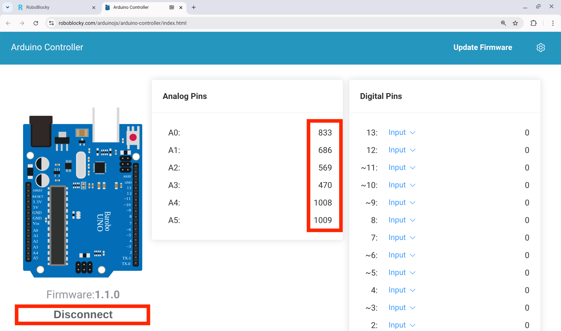 After RoboBlocky connects to the Arduino, a light on the board will start blinking. You will also see numbers next to analog pins A0 to A5 moving up and down. This means the connection is working. If the light stops blinking or the numbers stop changing, the connection may have been lost and you can repeat the connection steps again. You can stop the connection at any time by clicking "Disconnect." ![]()