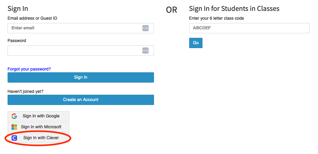 Once RoboBlocky has been added to the district's list of Clever apps, and students are enrolled in the teacher's class, there are two ways students can sign in to RoboBlocky and their teacher's class. Students go to the RoboBlocky sign-in page (https://roboblocky.com/sign_in.php) and click the “Sign In with Clever” button at the bottom left: